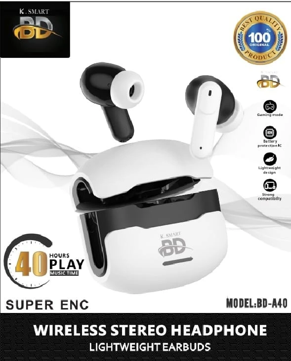 The KSMART BD-A40 Wireless Earphone delivers high-quality audio performance with an advanced Wireless 5.4 chip for a stable and powerful connection. Designed for comfort and long use, it offers excellent sound clarity for music, movies, and calls.